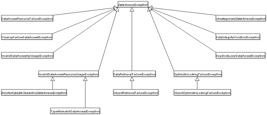 下图显示了Spring提供的异常层次结构。 (请注意,图像中详细描述的类层次结构仅显示整个DataAccessException层次结构的子集。)