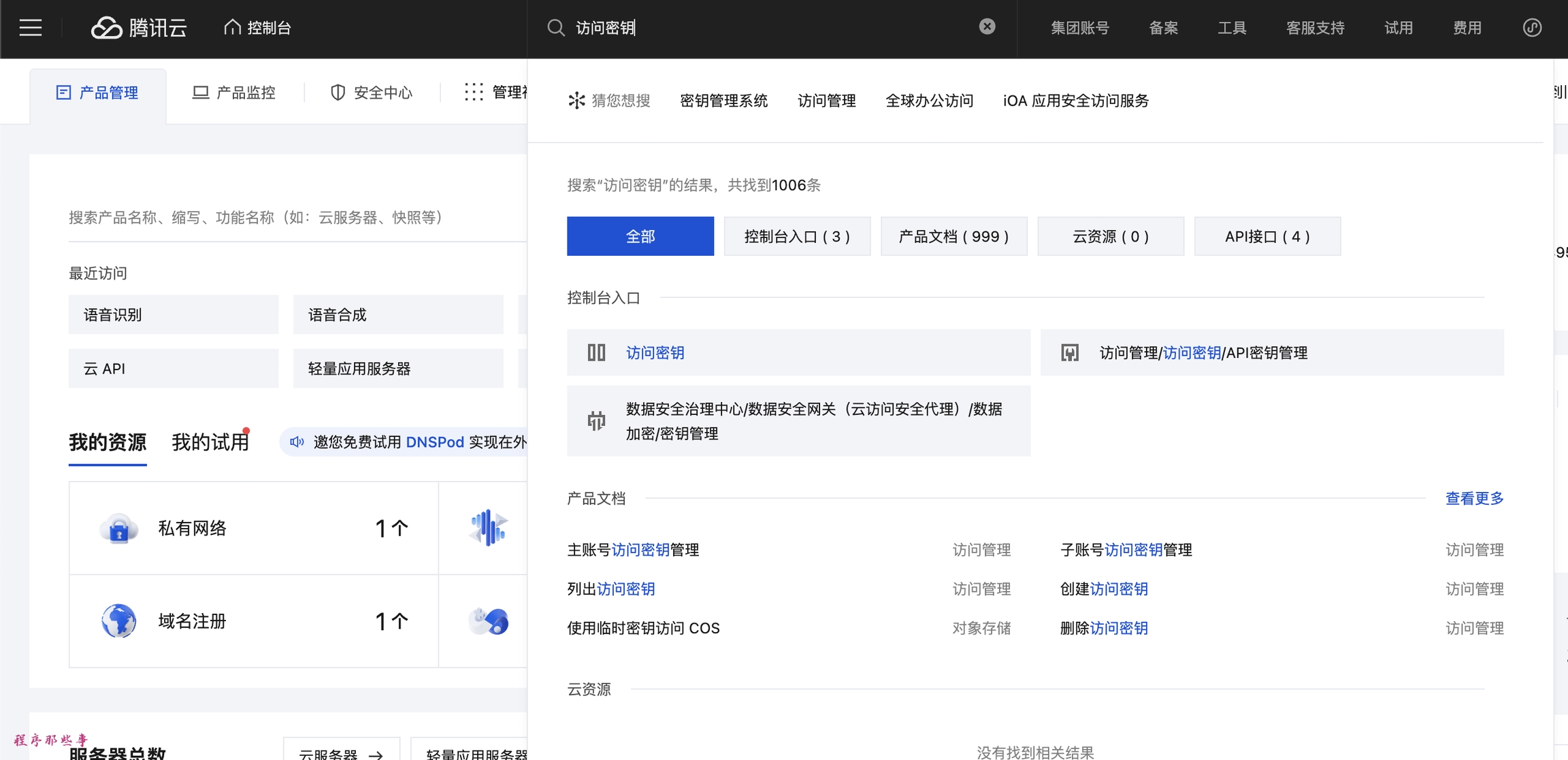 首先我们到腾讯云的官网上去注册一个账号,在最上面的搜索框, 我们输入访问密钥,在下面的控制台入口,点击访问密钥,即可进入腾讯云的访问密钥控制台。