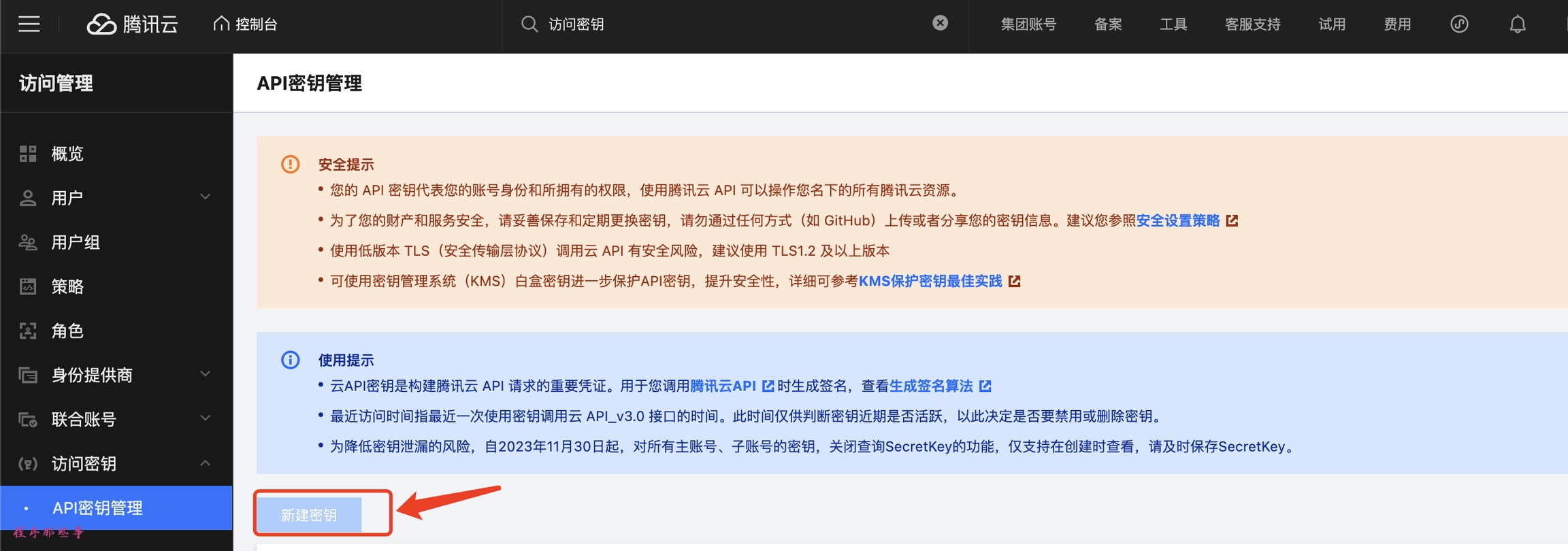 在API密钥管理部分,点击右边的新建密钥,即可生成APPID,SecretID和SecretKey这三个值。