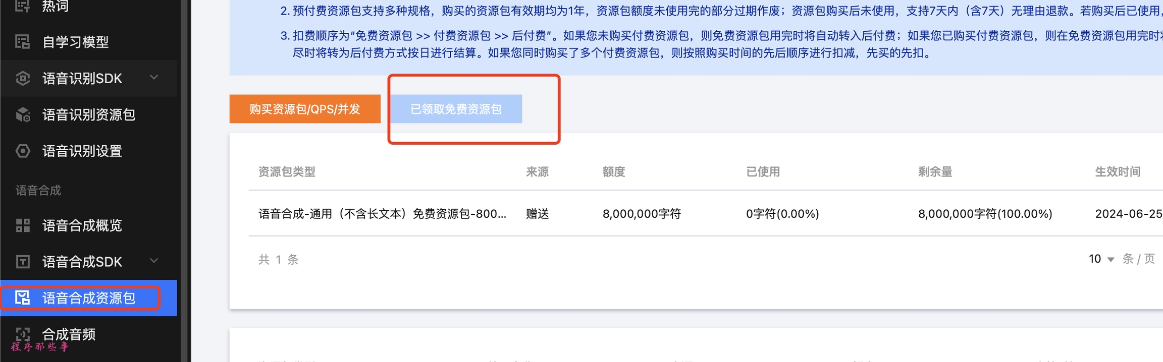 同样的,对于语音识别功能,我们同样可以领取免费的语音识别资源包。