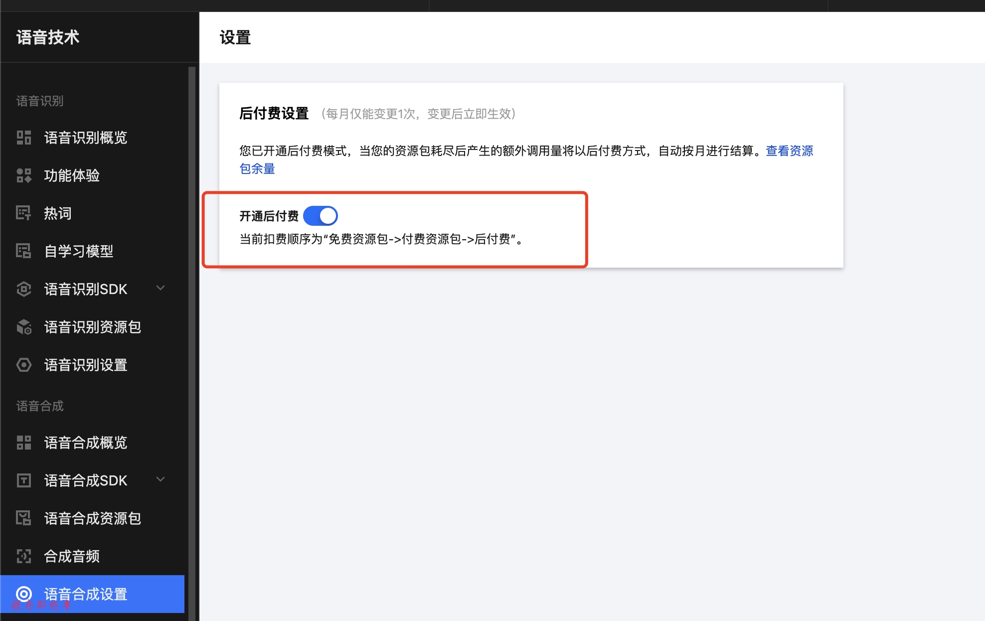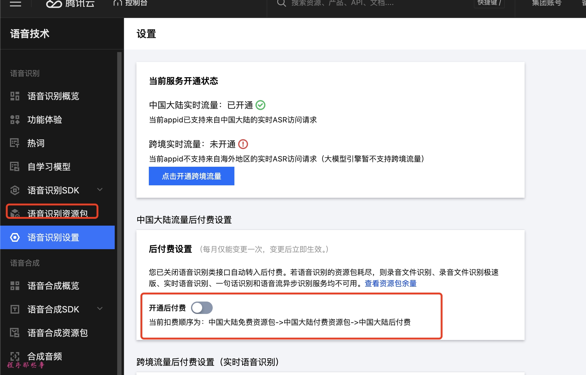 如果资源包不够用的话,可以在语音识别设置中开通后付费服务。