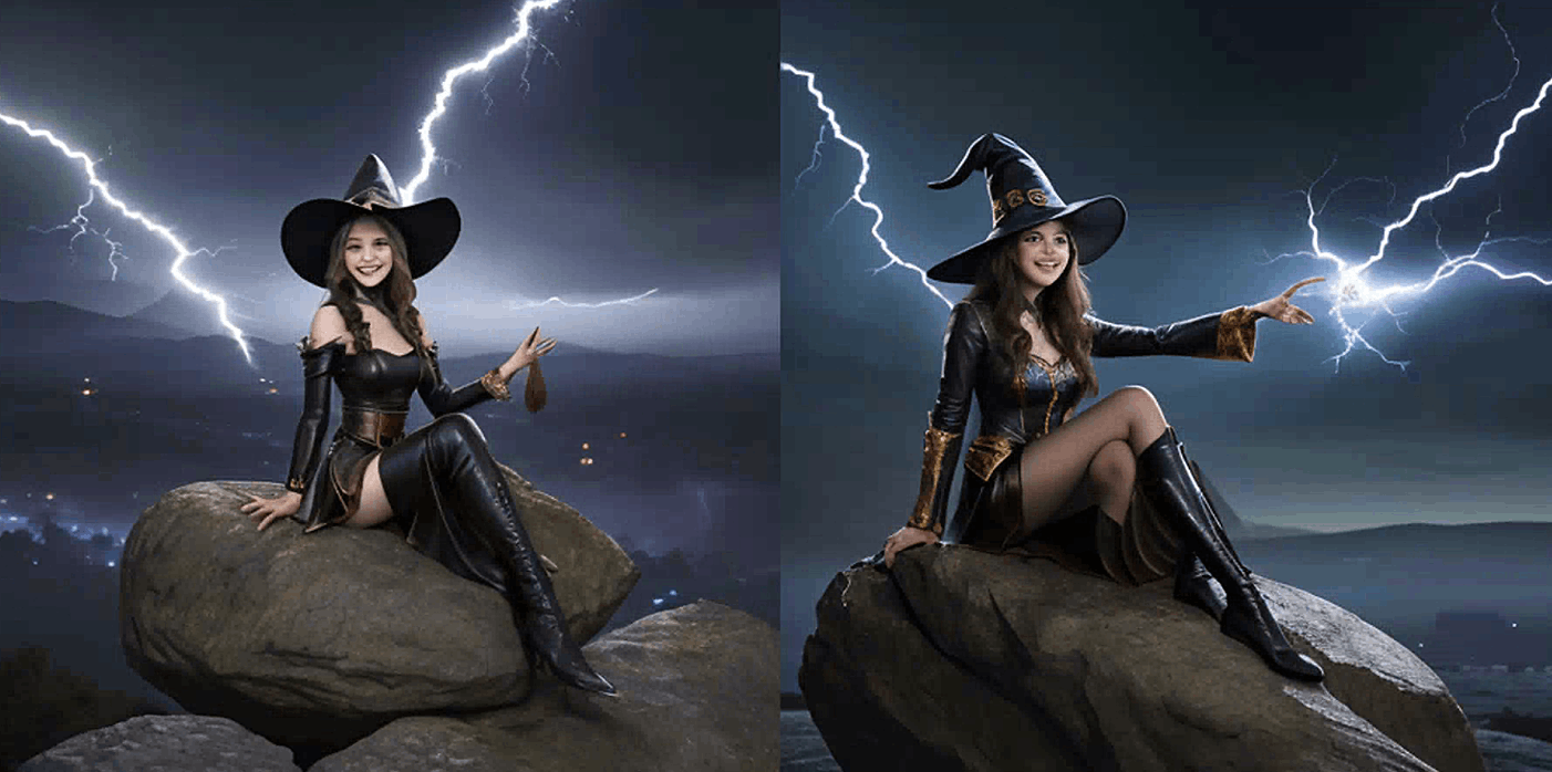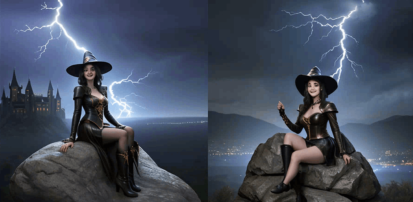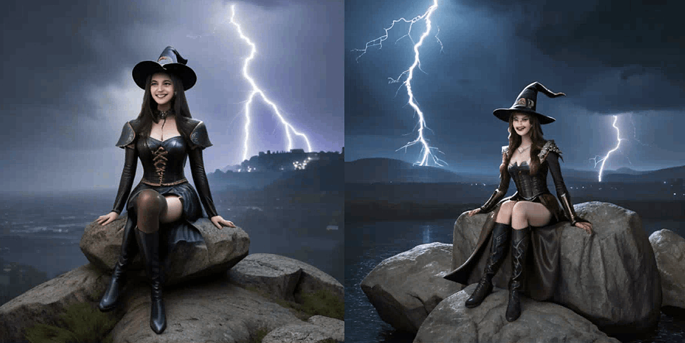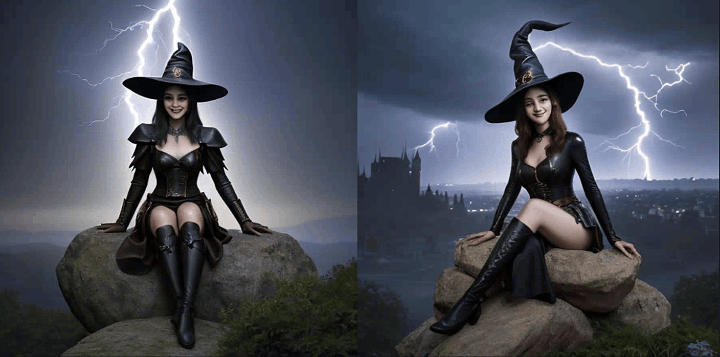 你会得到一些还不错的图像,但这个提示留下了太多想象的空间。 你希望女巫的样子是怎样的?你有没有一些关键词来更具体地描述她?她穿着什么?她施展的是什么样的魔法?她是站着、跑步还是漂浮在空中?背景是什么样的? Stable Diffusion 无法读取我们的想法。我们必须明确地表达我们想要的。 作为演示,比如说她是一个强大而神秘的女巫,使用闪电魔法。她穿着镶有宝石的皮革服装。她坐在一个岩石上。她戴着帽子。背景是一座城堡。