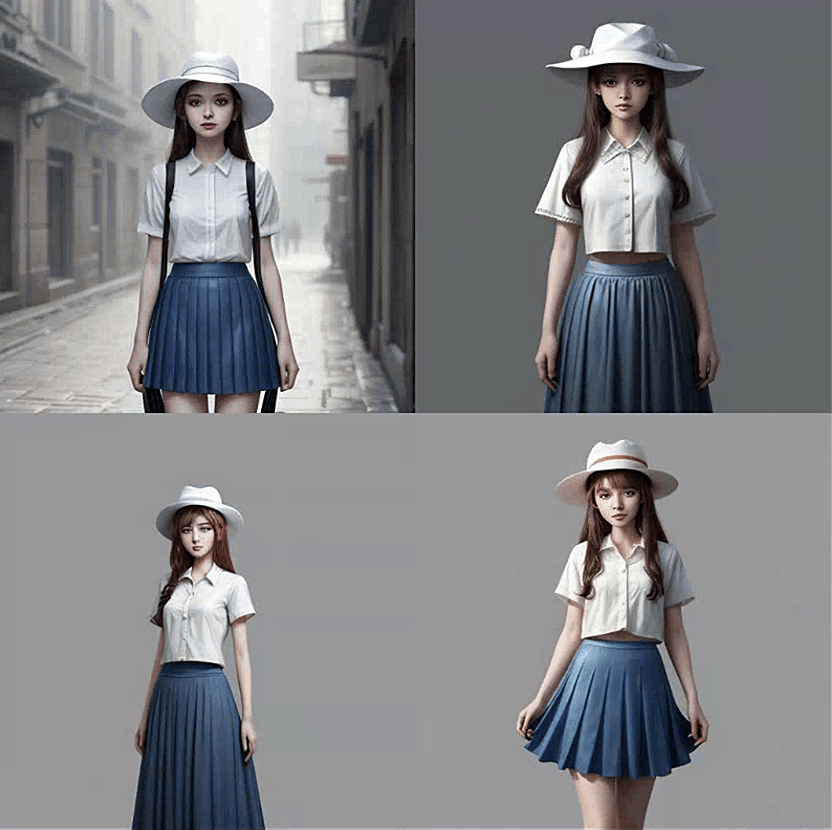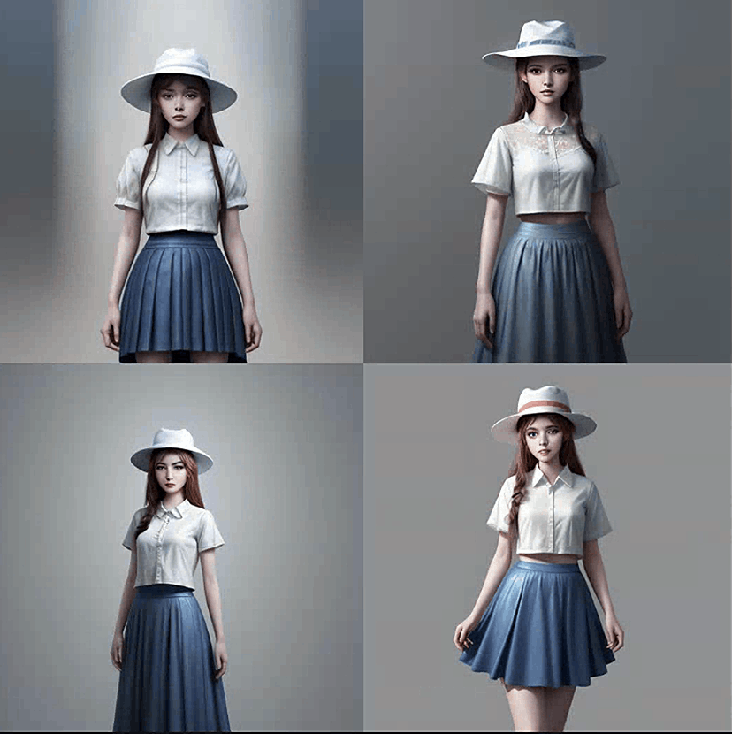 现在,我们生成更具体的图像。服装、姿势和背景在图像间保持一致。