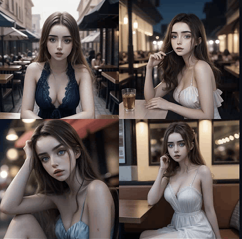 看到这张脸在不同的图片上重复出现了吧! 使用多个名人的名字和关键词权重来精心调整你想要的面部特征。你还可以在负面提示中使用名人的名字来避免你不想要的面部特征。