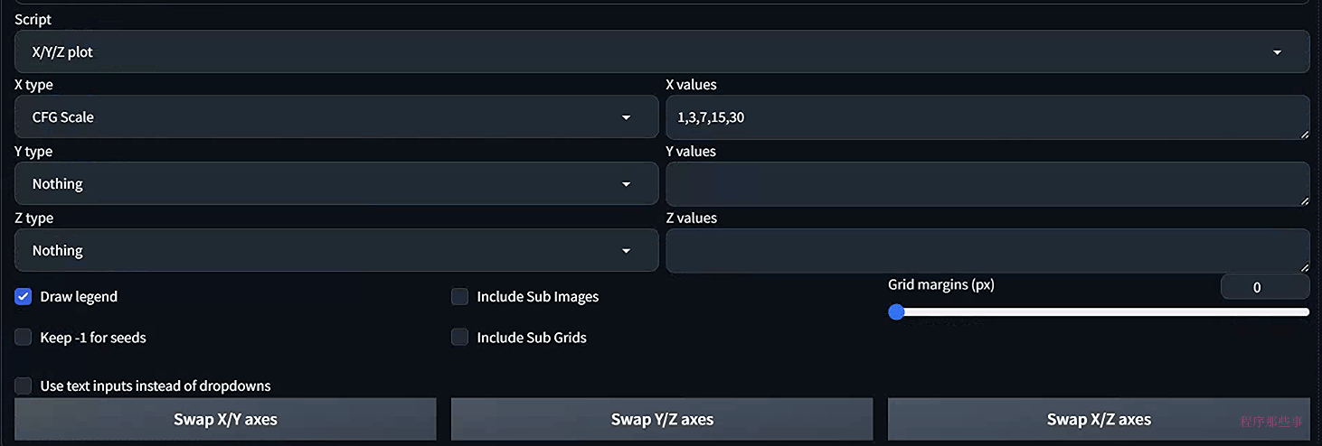 因为我们这里只有一个变量,所以X type选择CFG Scale. value字段设置为:1,3,7,15,30: