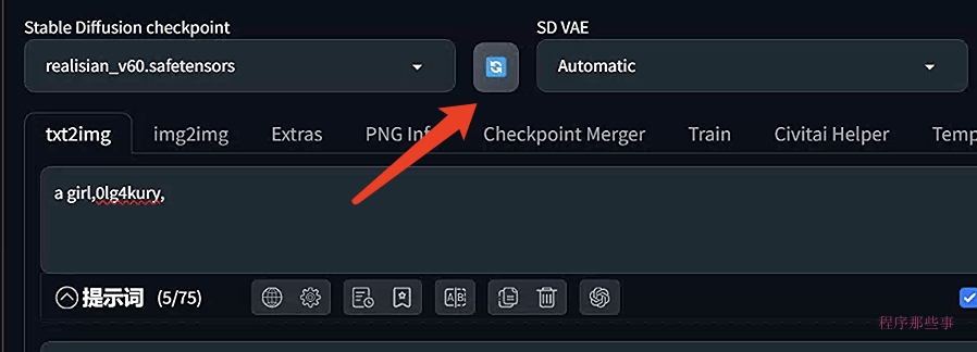 stable-diffusion-webui/models/Stable-diffusion/然后点击左侧顶部checkpoint下拉框旁边的刷新按钮。