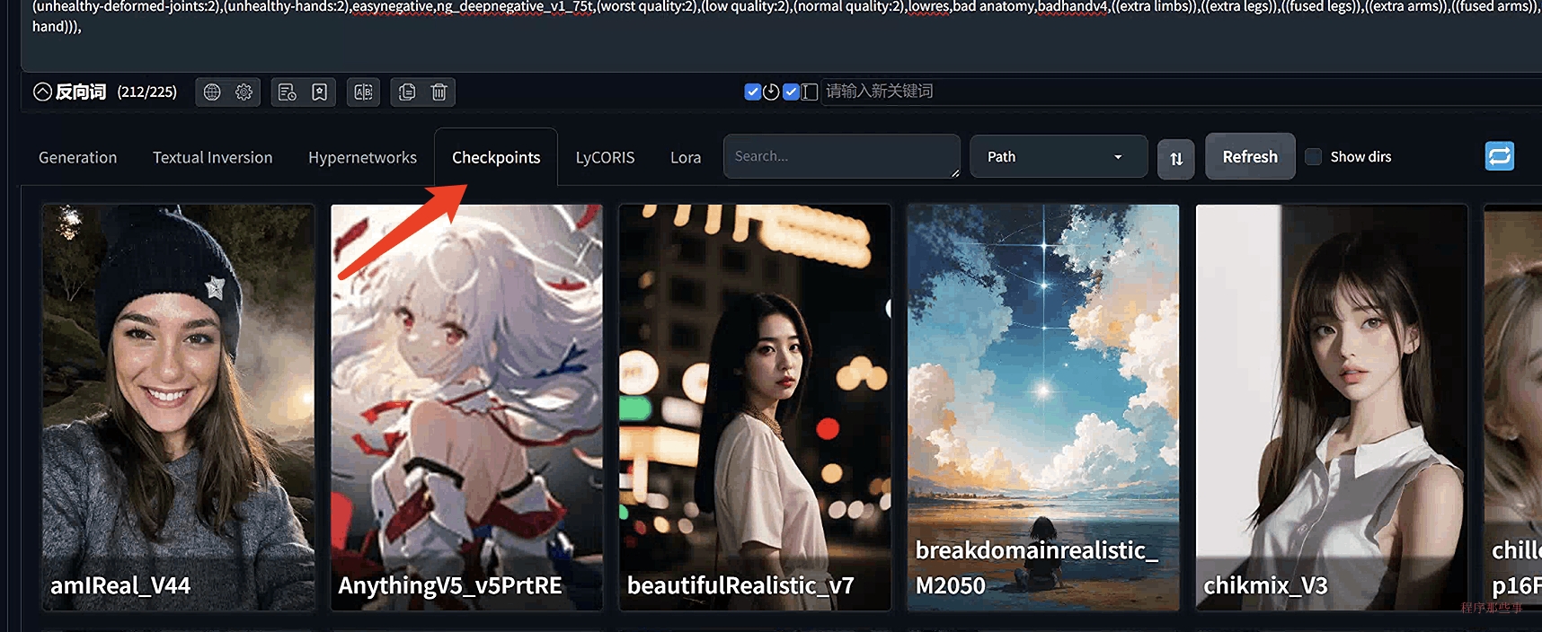 还有一种方法,就是在txt2img或img2img页面中,选择Checkpoints标签页,也可以看到对应的模型。