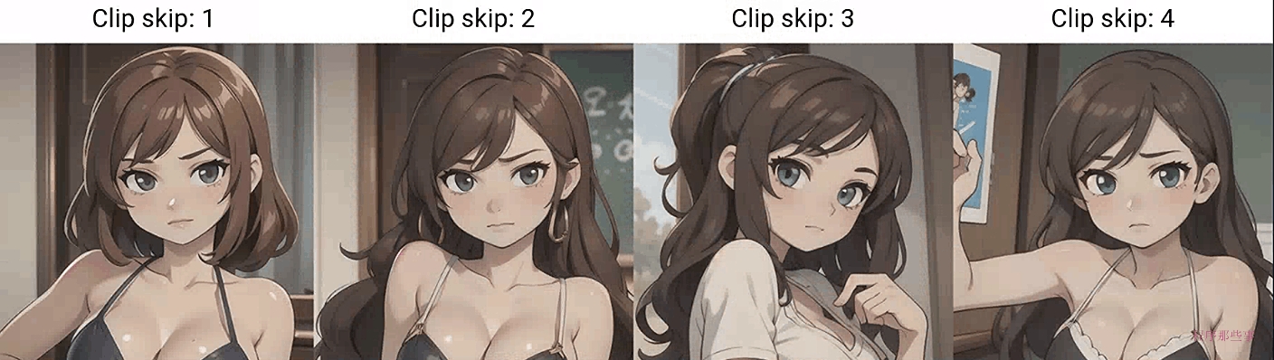 跳过CLIP层对图像可能会产生显著影响。许多动漫模型都是用CLIP Skip为2进行训练的。