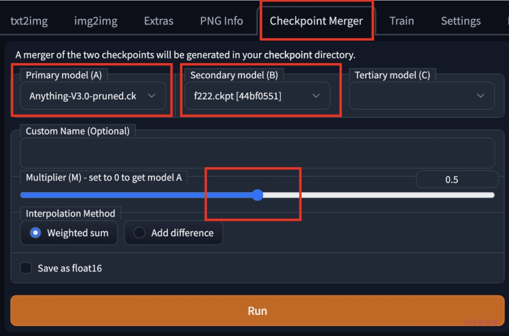 在webUI中合并两个models是非常简单的事情,我们导航到checkpoint Merger页面,选择好对应的两个模型,并调整乘数(M)以调整两个模型的相对权重。将其设置为0.5将以相等的权重合并两个模型。