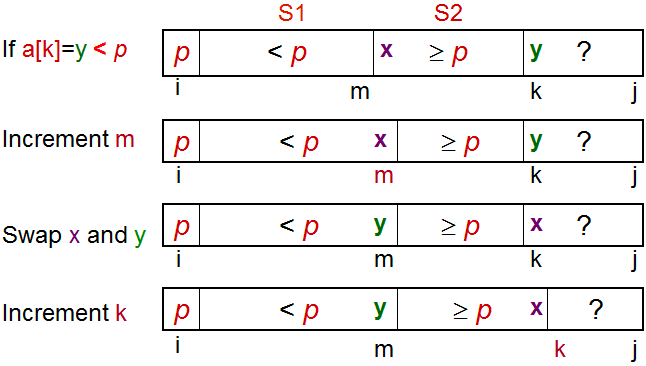 现在m+1位置的元素要么还没有进行比较,要么就是比中间节点的值要大,我们可以巧妙的将m+1位置的元素和k位置的元素互换位置,这样仍然能够保证m左侧的元素要比中间节点的值要小。