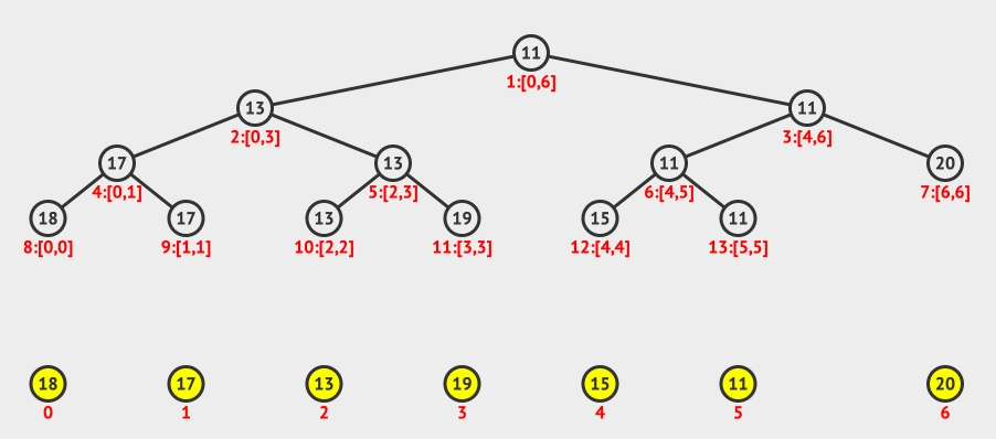 举个例子: index=1 的元素表示的是原始数组范围0-6,并且它的值是11,表示的是原始数组0-6范围中,最小的值是11。