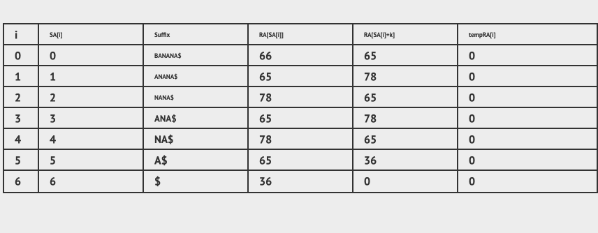 首先初始化 RA[SA[i]] 和 RA[SA[i] + k] ,第一轮的时候k=1, 我们取Suffix的首字母的ASCII值填充到RA[SA[i]] 和 RA[SA[i] + k] 中,超出数组范围部分我们置位 0, 于是得到下面的初始化图: