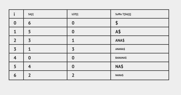 考虑一下PLCP[0], 因为是按照原字符串的顺序进行排列的,所以PLCP[0]对应的是BANANA$ 这个字符串和后缀数组SA中排在它前面的字符串ANANA$ 的公共前缀。