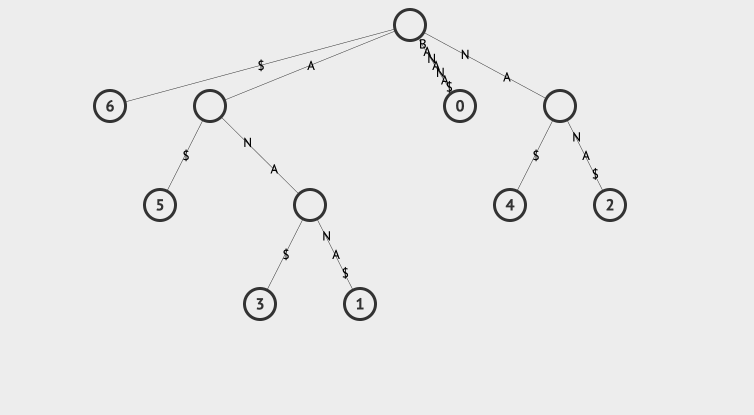举个例子,如果我们要存储一个单词叫做BANANA,我们以标志$作为单词的结尾,那么BANANA有多少后缀呢?