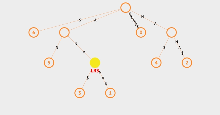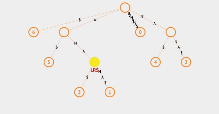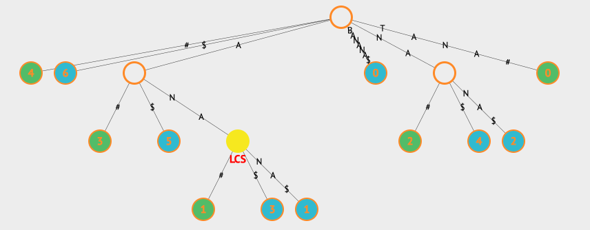 上面的例子中,LCS表示的是Longest Common Substring,我们同时用两种不同的颜色表示该节点属于哪一个字符串。