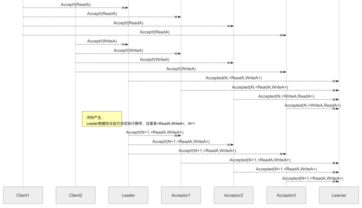 这种共识的前提就是不同命令的先后顺序无关。下面以序列图的形式更加详细的介绍: