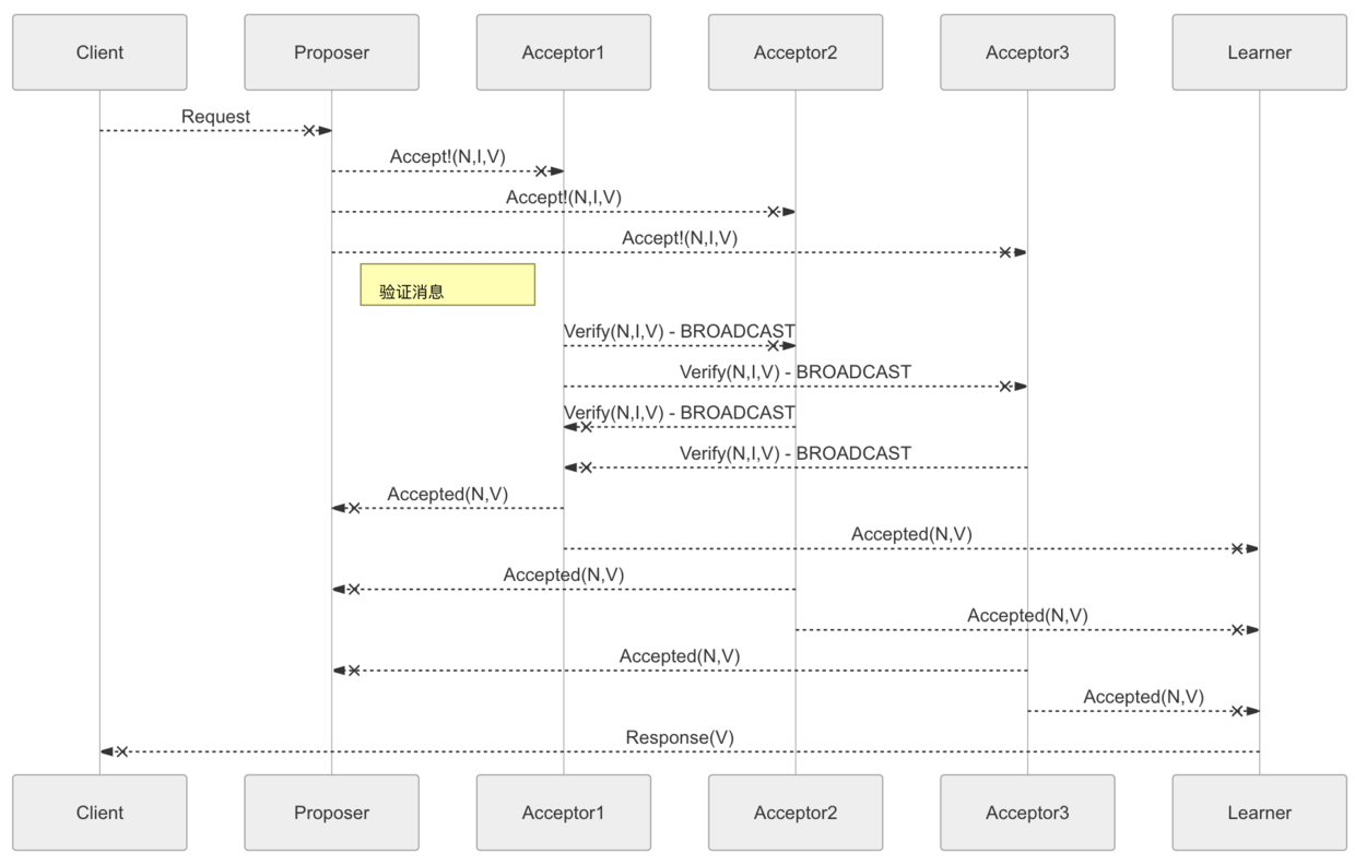 同样的也会有Fast Byzantine Multi-Paxos,为了更加Fast,本协议将Verify和Accepted进行融合,放在一步完成。