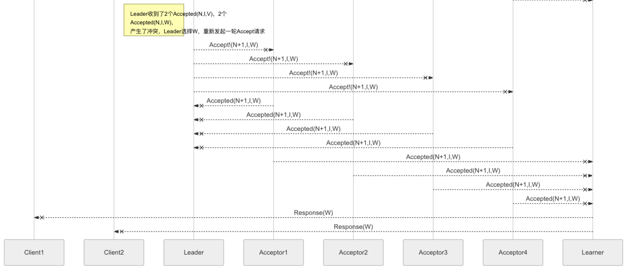 Leader检测到冲突之后,根据规定的算法从冲突中选择一个数据,重新发送Accept请求。如下图所示: