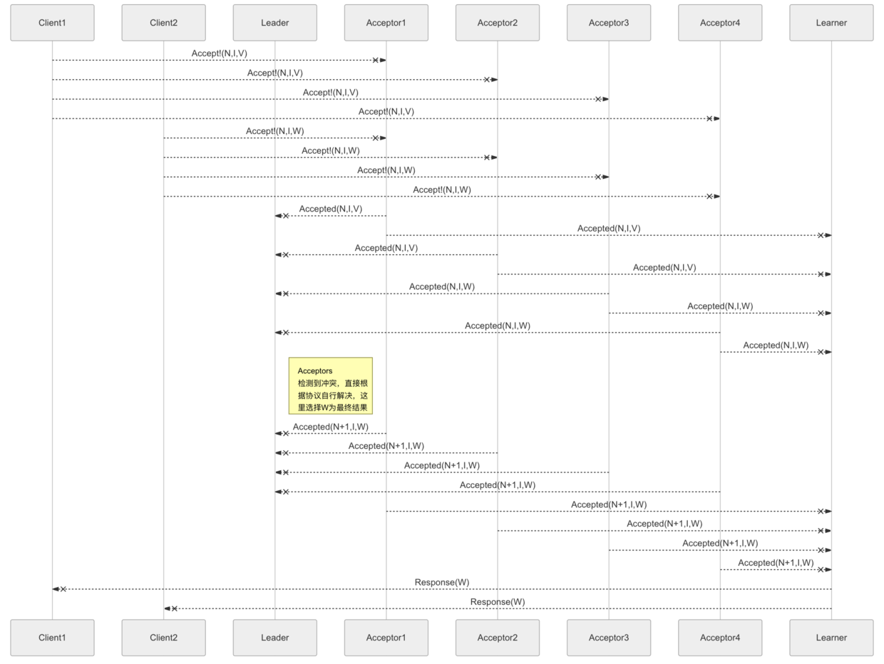 当检测到冲突的时候,如果Acceptors自己就能解决冲突,那么就完全不需要Leader再次发送Accept请求了,这样就又减少了一次请求,节省了时间。如下图所示: