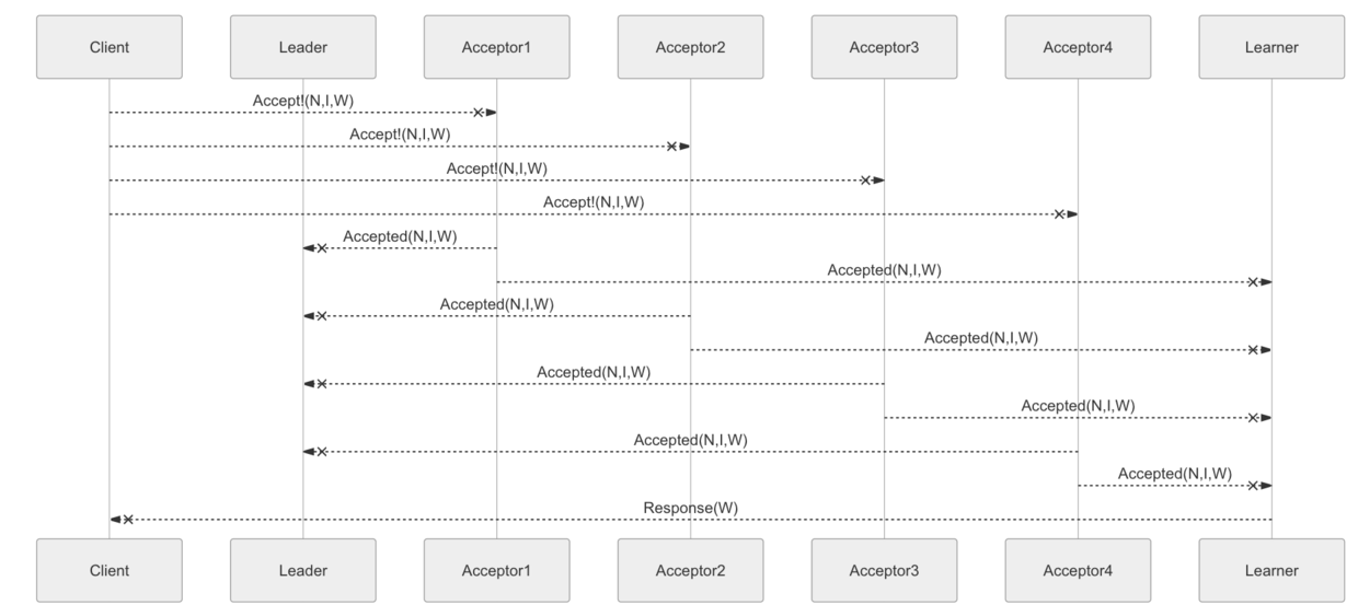 这里还要注意一点,Client 发送请求给Proposer是直接发送给Leader,也就是发送一次就够了,但是发给Acceptor的话就要所有的Acceptors都发一遍。