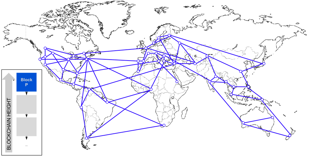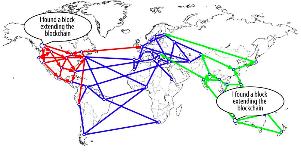两个矿工在各自的候选区块一发现解,便立即传播自己的“获胜”区块到网络中,先是传播给邻近的节点而后传播到整个网络。
