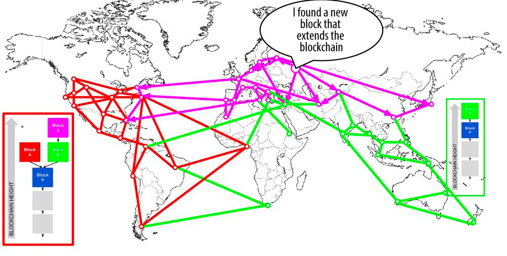 然而,那些选择“红色”区块为胜出者的节点现在会看到两个链:“蓝色-绿色-粉色”和“蓝色-红色”。