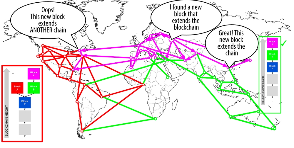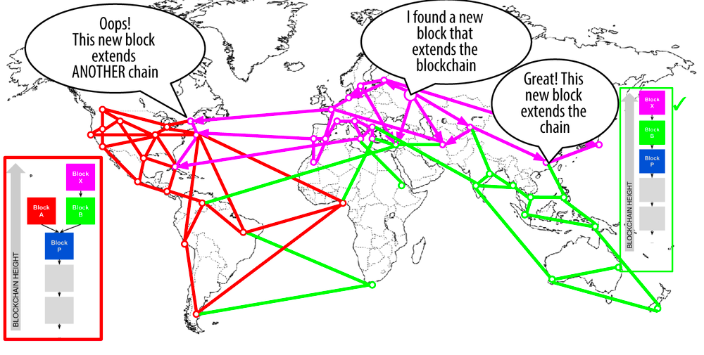 因为区块链是去中心化的数据结构,所以不同副本之间不能总是保持一致。区块有可能在不同时间到达不同节点,导致节点有不同的区块链视角。解决的办法是,每一个节点总是选择并尝试延长代表累计了最大工作量证明的区块链,也就是最长的或最大累计难度的链。