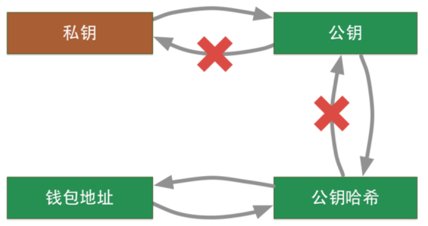 所以私钥,公钥和钱包地址的关系如下图所示: