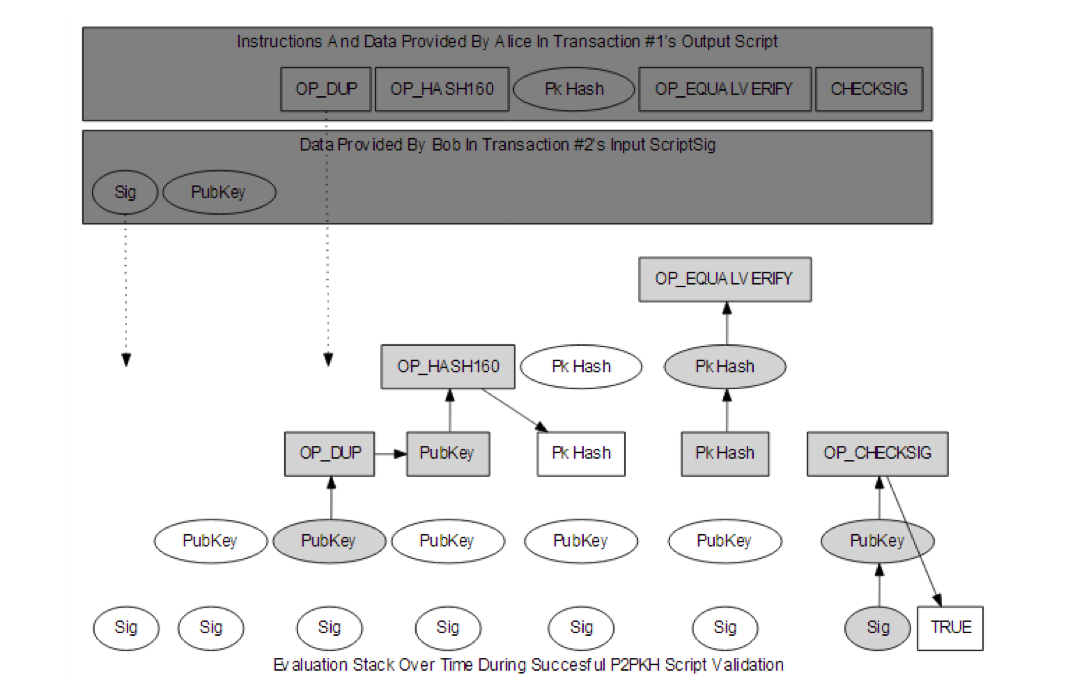 验证方提供两个值,一个是sig,一个是PubKey。因为比特币的虚拟机是栈结构的,我们先把这两个值入栈。