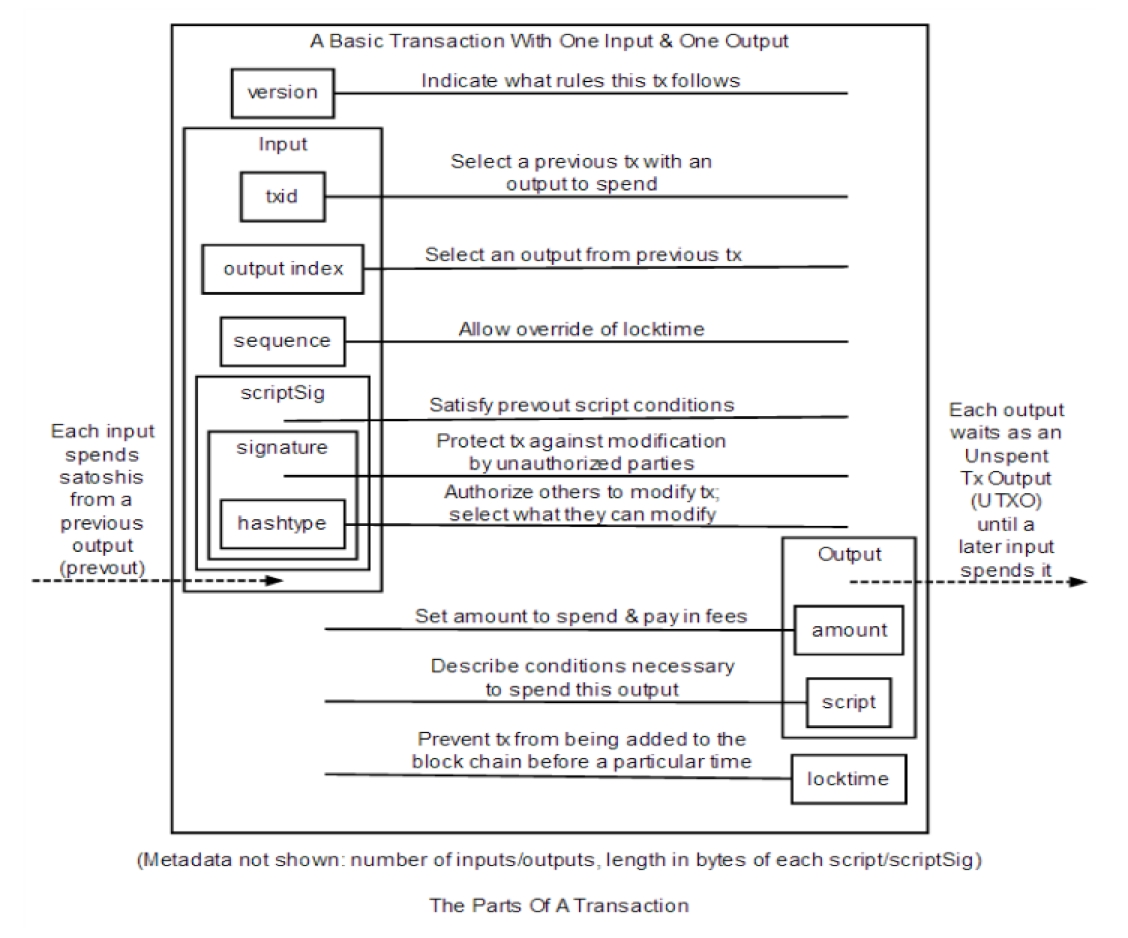 再来回顾一下上图的比特币中区块链中交易的构造。
