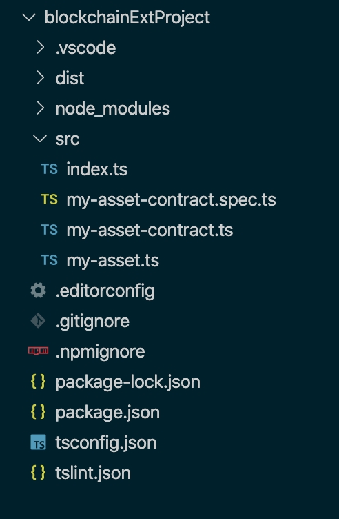 该扩展程序将根据你选择的语言和资产名称生成一个框架合同。完成后,你可以导航到“资源管理器”视图(最有可能在左侧栏中的顶部图标,看起来像“文档”图标)并打开src / my-asset-contract.ts文件以查看你的智能合约代码脚手架。
