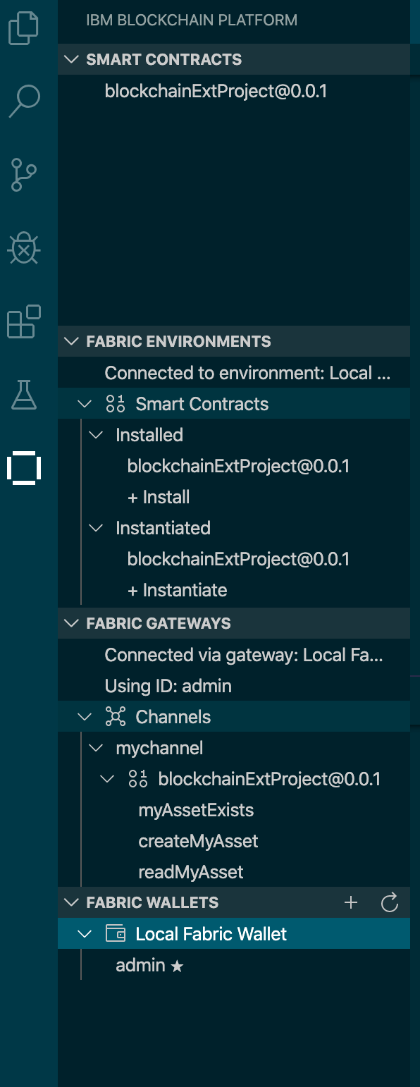 要使用网关,你还需要用于在该网络上进行交易的身份。同样,对于本地Fabric运行时,已经为你设置了此时间。请注意,在FABRIC WALLETS下有一个名为local_fabric_wallet的钱包,其中包含一个名为admin的ID。如果将鼠标悬停在“ FABRIC GATEWAYS”面板中的“ local_fabric”上,你会看到它告诉你“关联的钱包:local_fabric_wallet”。