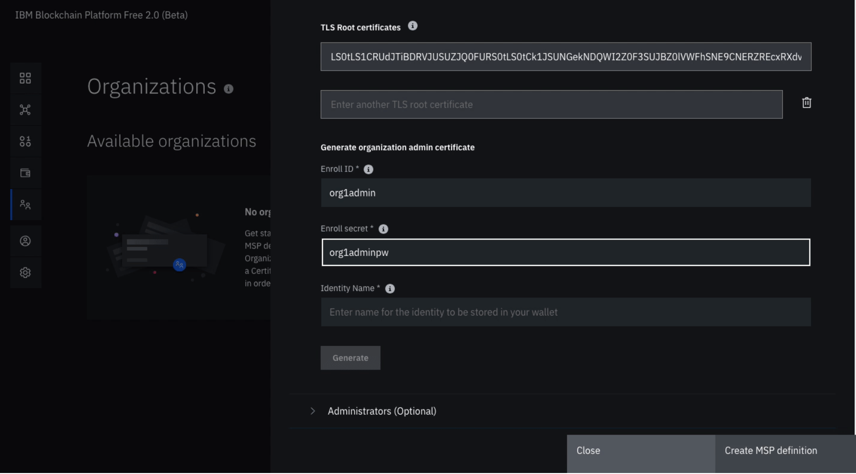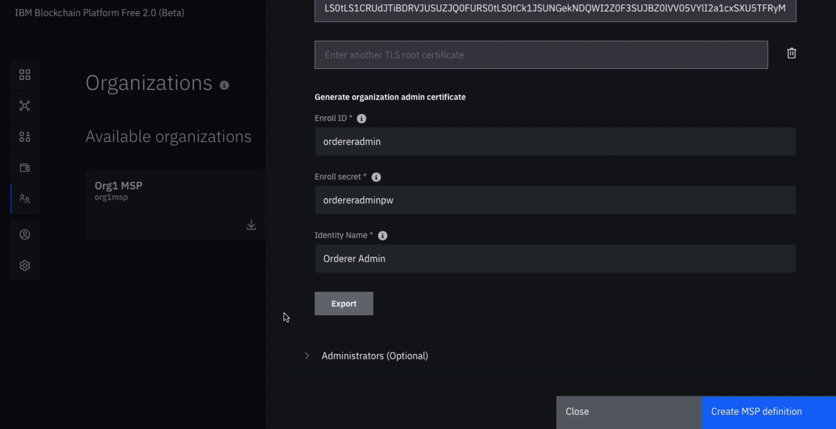 点击Generate和Export来生成该组织的admin identity并将其导出到本地文件系统。最后,点击Create MSP definition完成MSP的创建。