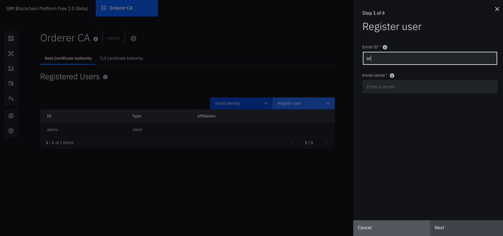 orderer1,orderer1pw作为Enroll ID 和Enroll secret 。