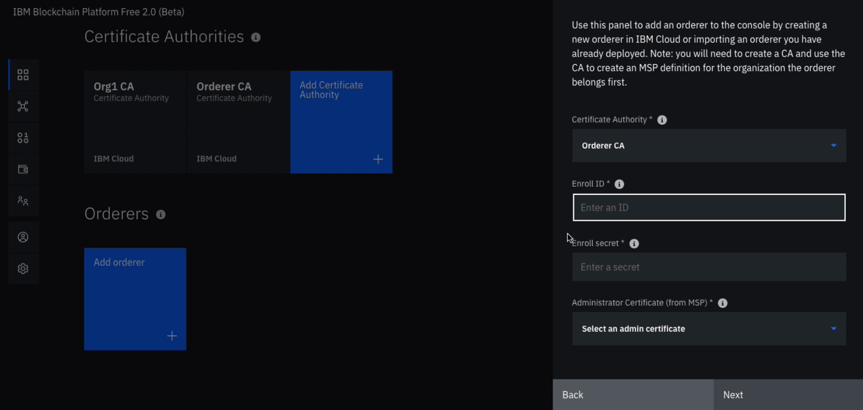 点击Add orderer,Orderer作为Display name ,Orderer CA作为Certificate Authority。