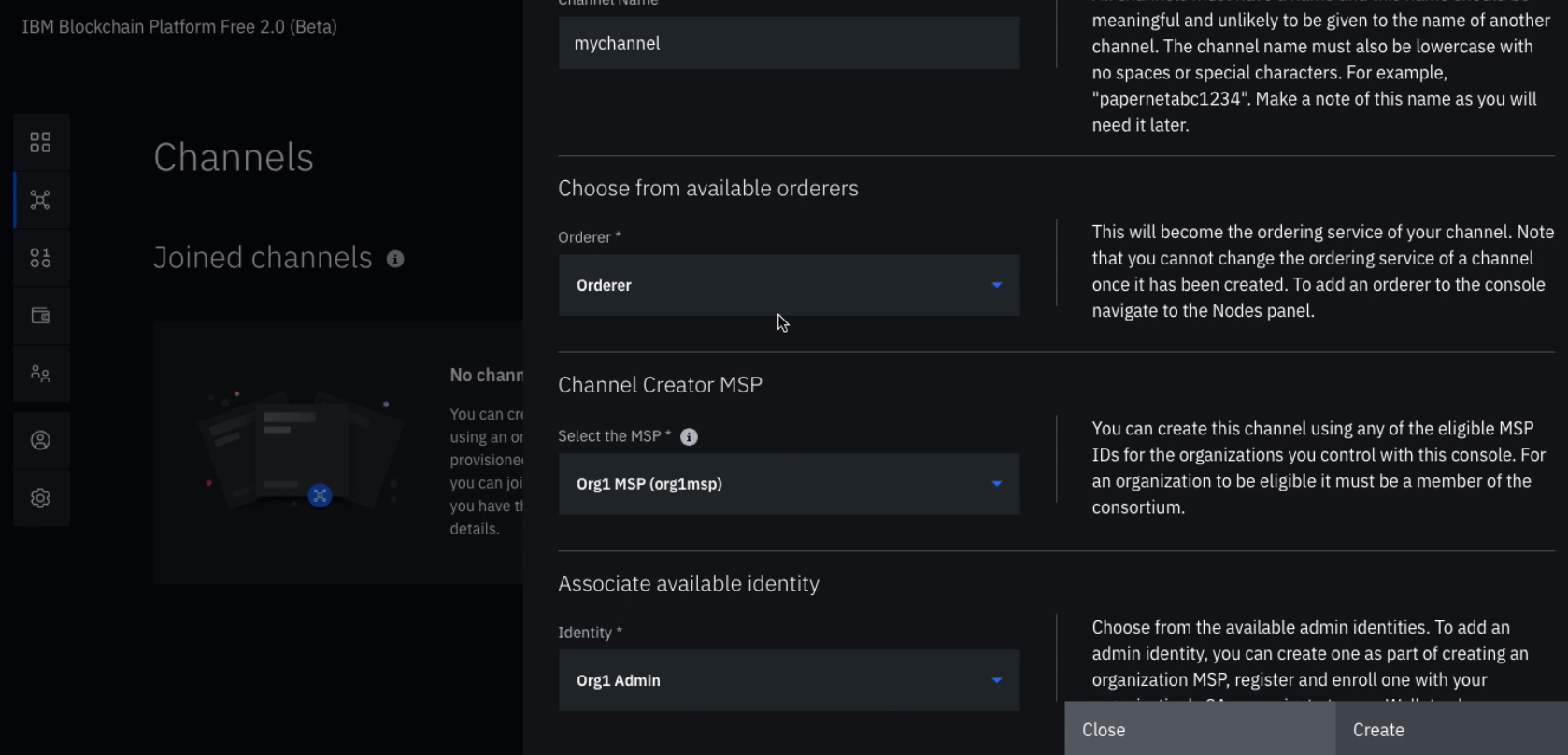 选择刚刚创建的order,选择Org1 MSP (org1msp)作为MSP。