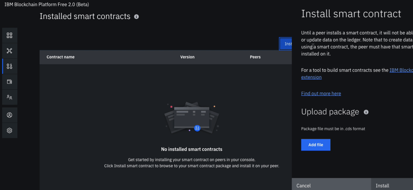 点击Smart contracts,点击 Install smart contract,选择我们之前导出的智能合约。