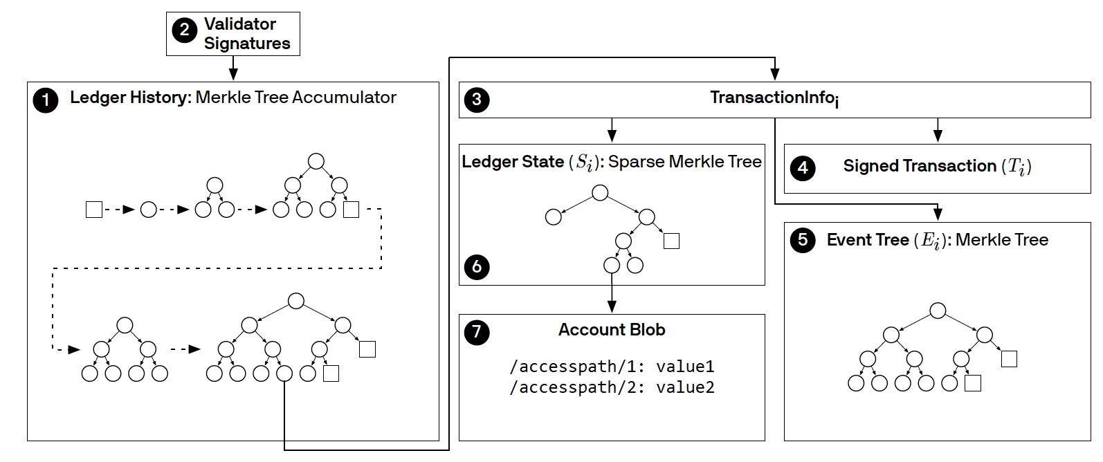 还有交易i执行过后的账本状态(6),是用Sparse Merkle树来表示的,其中它的叶子节点是账户信息。