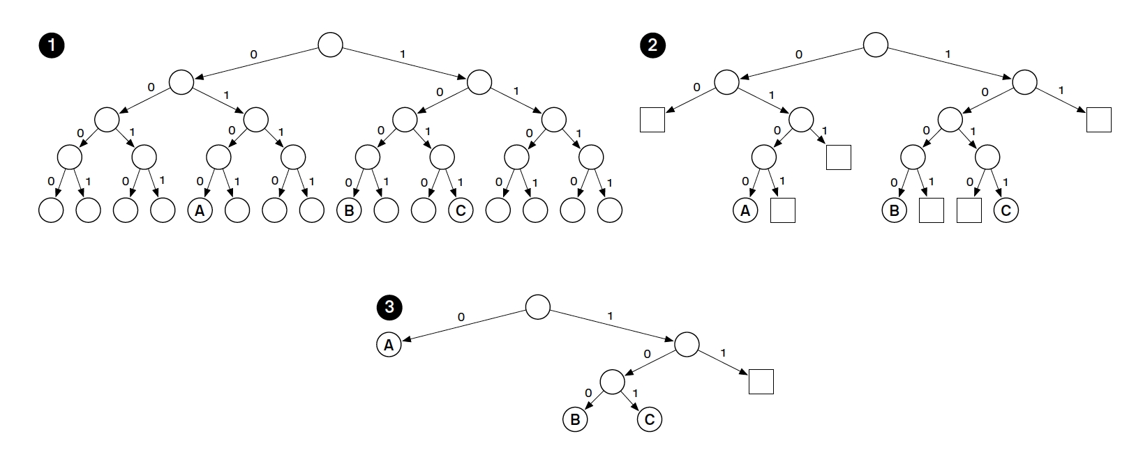 在(2)中,我们将所有的空节点用方框表示。这样会导致树的不平衡,因为叶子节点总是树的最低一层。那么我们可以做适当的优化如(3)所示。