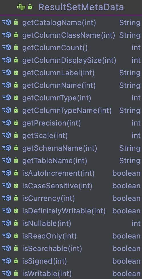 boolean b = rsmd.isSearchable(1);ResultSetMetaData提供了很多非常有用的元数据检测方法: