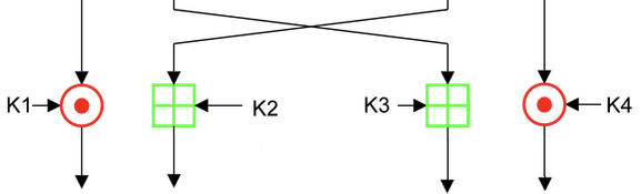 上面图中, 蓝色圆圈是XOR异或操作,绿色框是加法模数216。红色的点是乘模216 + 1,如果输入都是0(0x0000)那么将会被转换为216,如果输入是216,那么会被转换为0(0x0000)。