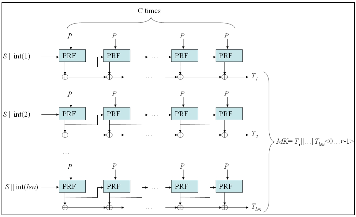 在上一节中,我们可以看到其实最后的衍生key是由好几部分组成的,上图中的每一个T都代表着衍生key的一部分,最后将这些T合并起来就得到了最终的衍生key,其公式如下: