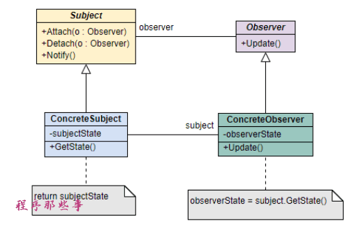 ConcreteObserver: 观察者对象,其关注对象为 Subject,能接受 Subject 变化时发出的通知并更新⾃身状态。