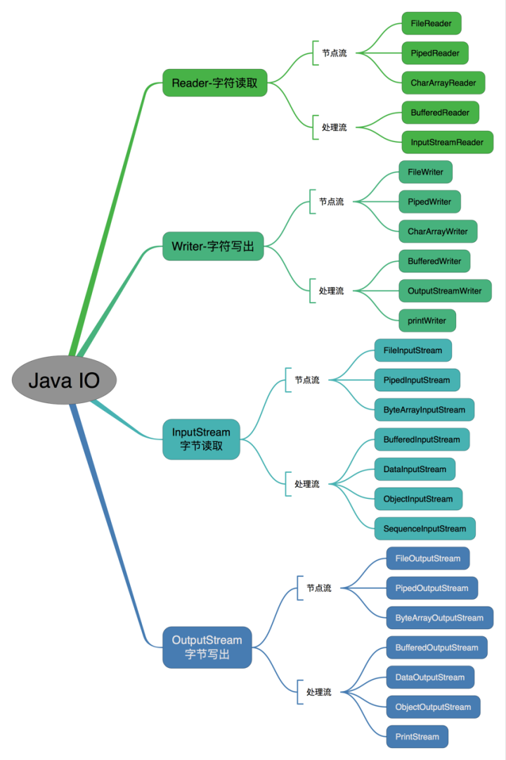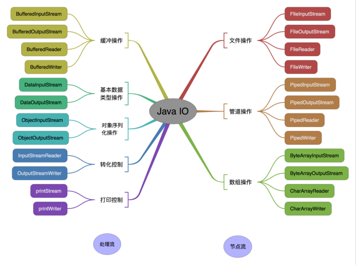 按照操作单元划分,可以划分为字节流和字符流; 按照流的角色划分为节点流和处理流。