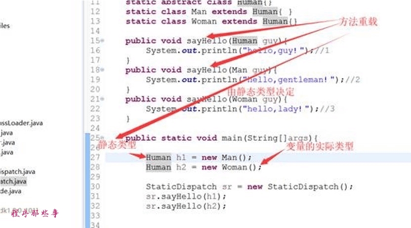 代码中定义了两个静态类型相同但实际类型不同的变量,但虚拟机(准确地说是编译器)在重载时是通过参数的静态类型而不是实际类型作为判定依据的。并且静态类型是编译期可知的,因此,在编译阶段,Javac 编译器会根据参数的静态类型决定使用哪个重载版本,所以选择了 sayHello(Human)作为调用目标。所有依赖静态类型来定位方法执行版本的分派动作称为静态分派。静态分派的典型应用是方法重载。静态分派发生在编译阶段,因此确定静态分派的动作实际上不是由虚拟机来执行的。