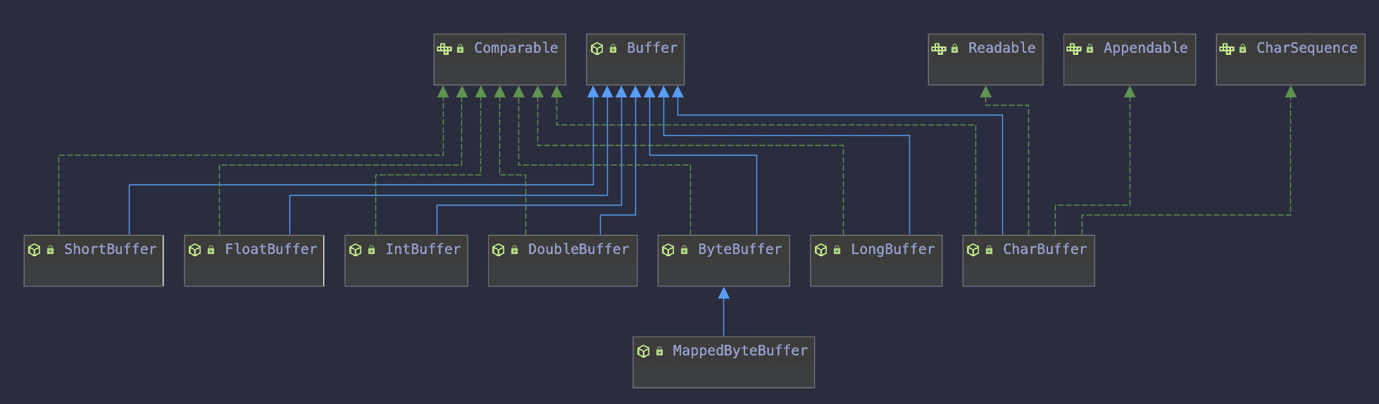 Buffer是一个接口,它下面有诸多实现,包括最基本的ByteBuffer和其他的基本类型封装的其他Buffer。