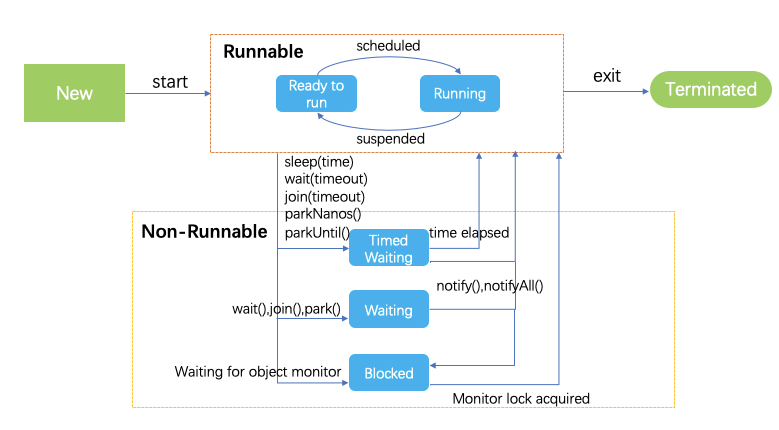 为什么这两种都叫做Runnable呢?我们知道在多任务环境中,CPU的个数是有限的,所以任务都是轮循占有CPU来处理的,JVM中的线程调度器会为每个线程分配特定的执行时间,当执行时间结束后,线程调度器将会释放CPU,以供其他的Runnable线程执行。