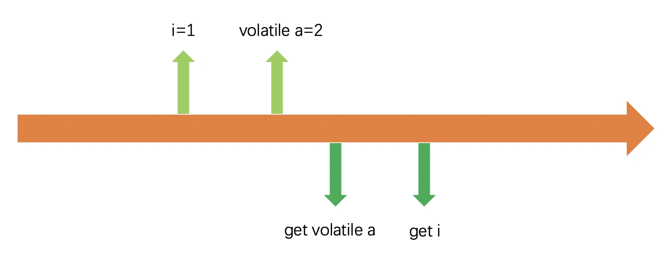 线程1中有两个指令:set i=1, set volatile a=2。 线程2中也有两个指令:get volatile a, get i。