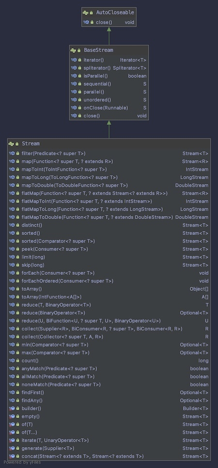 从上面的图中我们可以看到Stream继承自BaseStream。Stream中定义了很多非常实用的方法,比如filter,map,flatmap,forEach,reduce,collect等等。接下来我们将会逐一讲解。