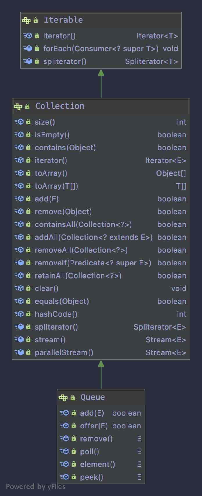 注意,因为对poll和peek来说null是有特殊含义的,所以一般来说Queue中禁止插入null,但是在实现中还是有一些类允许插入null比如LinkedList。